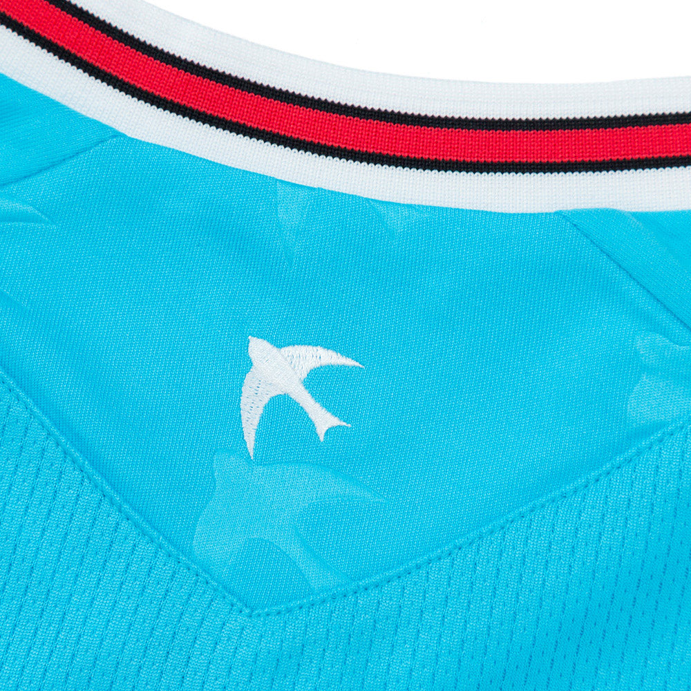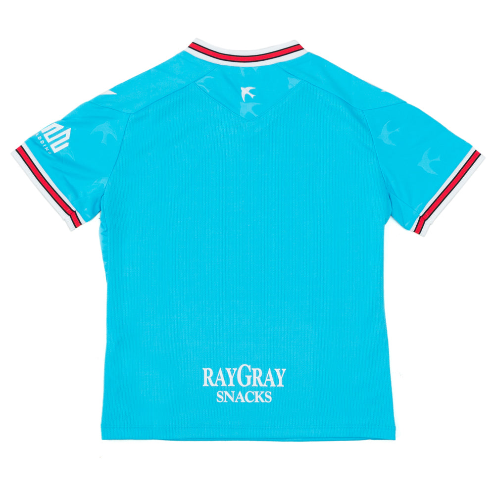 This Walsall Football Club 25/26 Third Shirt features a sky blue base with intricate red, white, and black detailing along the neck and sleeves. The body showcases embossed Swifty bird motifs, adding texture and depth to the design. Finished with a classic V-neck, this shirt combines style and comfort tailored for young fans.