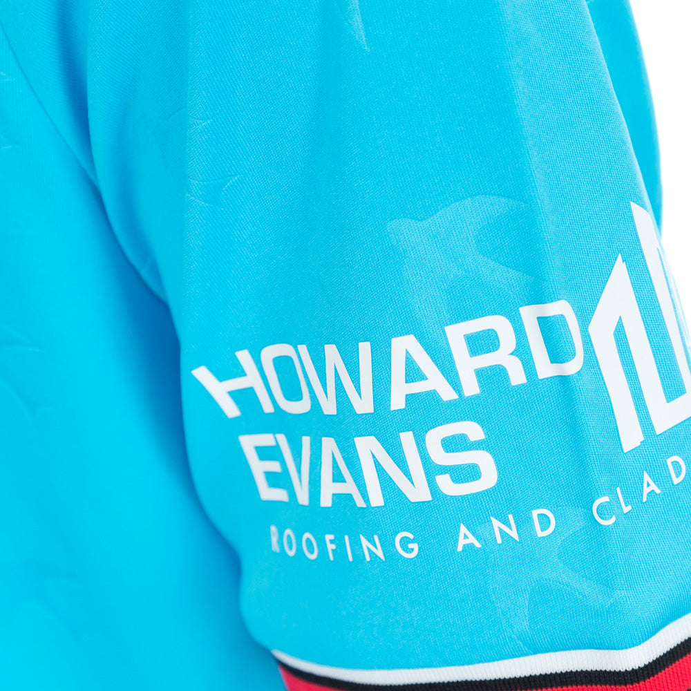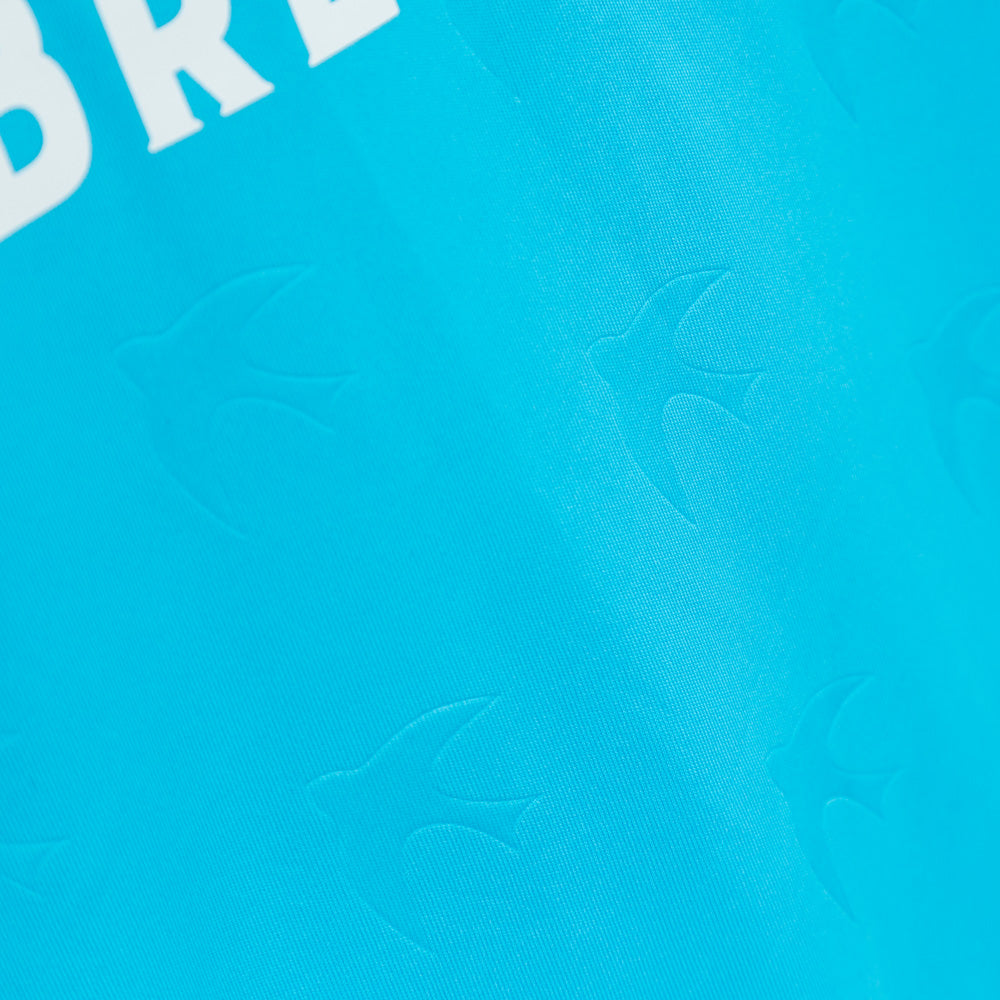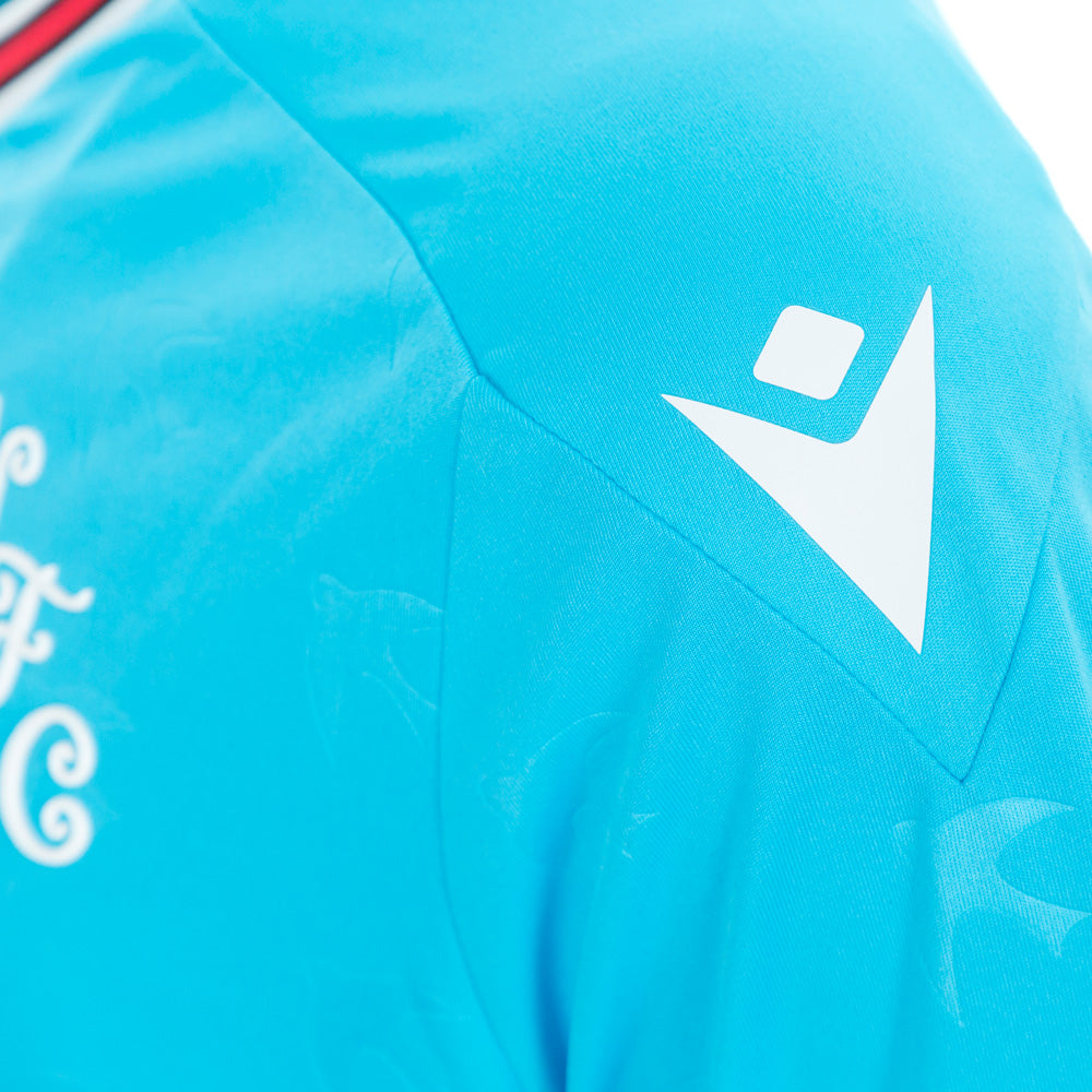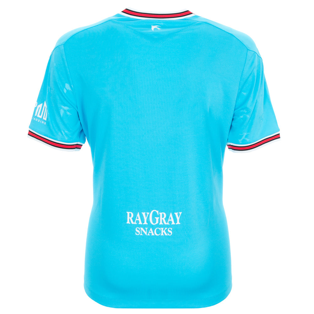 This Walsall Football Club 25/26 Third Shirt features a sky blue base with intricate red, white, and black detailing along the neck and sleeves. The body showcases embossed Swifty bird motifs, adding texture and depth to the design. Finished with a classic V-neck, this shirt combines style and comfort tailored for young fans.